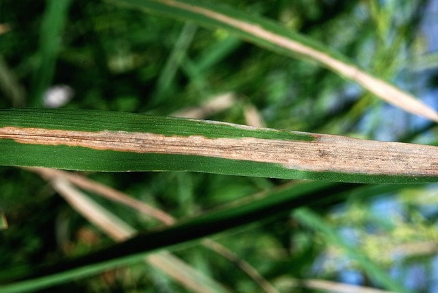 - On leaves, the disease causes narrow, translucent streaks along the leaf veins, which later turn yellow and then brown. The streaks may coalesce and cover the entire leaf blade, causing it to dry up and fall off. This symptom is known as leaf blight.