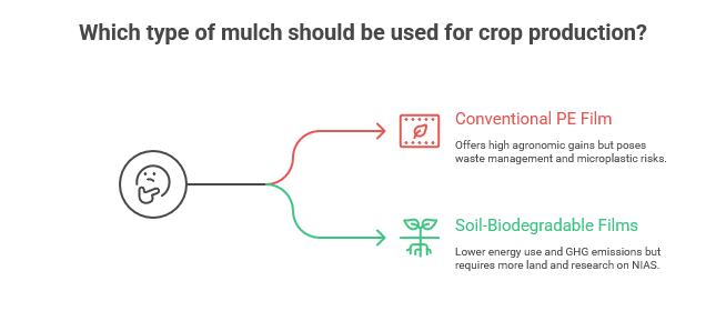 - Conventional PE film: Highest agronomic gains but leaves waste management challenges and microplastic risk if retrieval is incomplete; residual film fragments can reduce yield/WUE.[1][5]