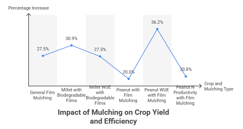 Crop‑specific work in peanut found yield +20% with WUE +36% and nitrogen partial factor productivity (NPFP) +20.8%. Mechanistically, mulching warms the seedbed, limits evaporative loss, and smooths early‑season stress, translating to stronger stands and higher harvestable output.[1][3][2]
