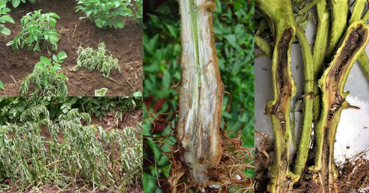 - If the stem of the affected plant is sliced and placed in clean water, a milky white pus is secreted after some time. Harvested potatoes also exhibit white pus in their eyes and begin to rot within a few days.