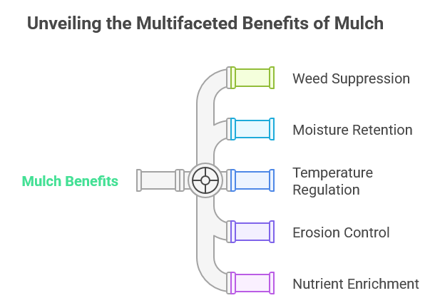 `Key benefits of mulch: suppresses weeds, retains moisture, regulates temperature, controls erosion and enriches soil.