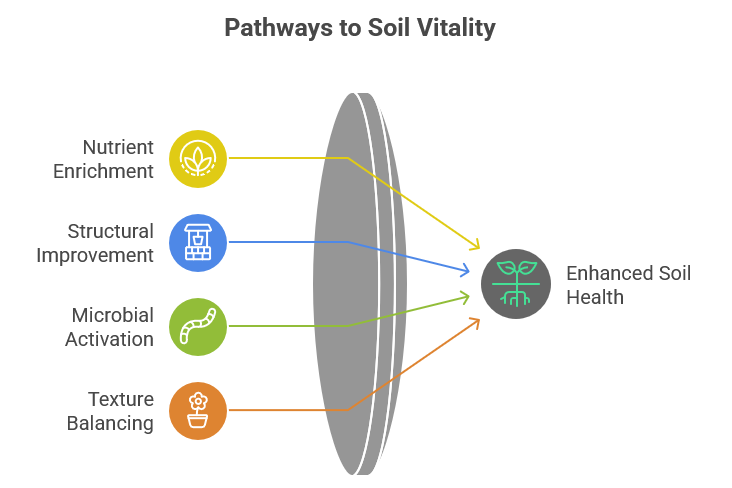Pathways to soil vitality include nutrient enrichment, structural improvement, microbial activation, and texture balancing to achieve enhanced soil health.
