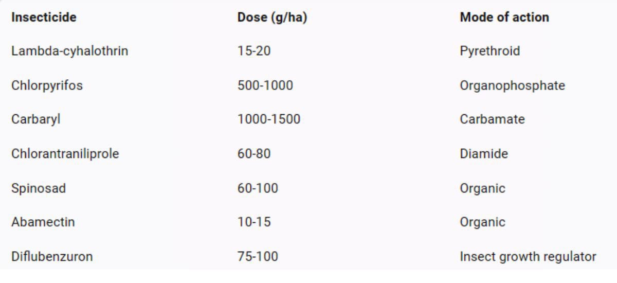 Some examples of recommended insecticides and their doses for Fall Armyworm control on maize are:
