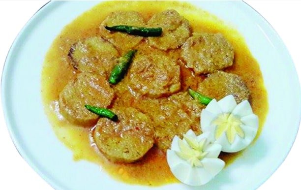 6 boiled eggs, 16 round slices of taro (a half-inch thick), 1 cup of sour curd, 3 tablespoons of onion powder, ½ teaspoon of masala powder, 2 tablespoons of onion paste, 1 tablespoon of garlic paste, ½ teaspoon of chili powder teaspoon, half a teaspoon of pepper powder, 4/5 teaspoon of green pepper, half a tablespoon of poppy seed paste, half a tablespoon of almond paste, 1 teaspoon of coriander paste. Raisins 1 tablespoon, cardamom, cinnamon, and bay leaves 2 each, sugar 1 teaspoon, ghee-oil half a cup, salt to taste.