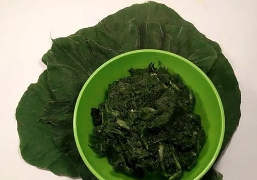 - Once the taro leaves are boiled and the water dries up, add chopped onions, garlic cloves, salt, and green chilies. When it becomes thick, mash it with mustard oil and lemon juice.