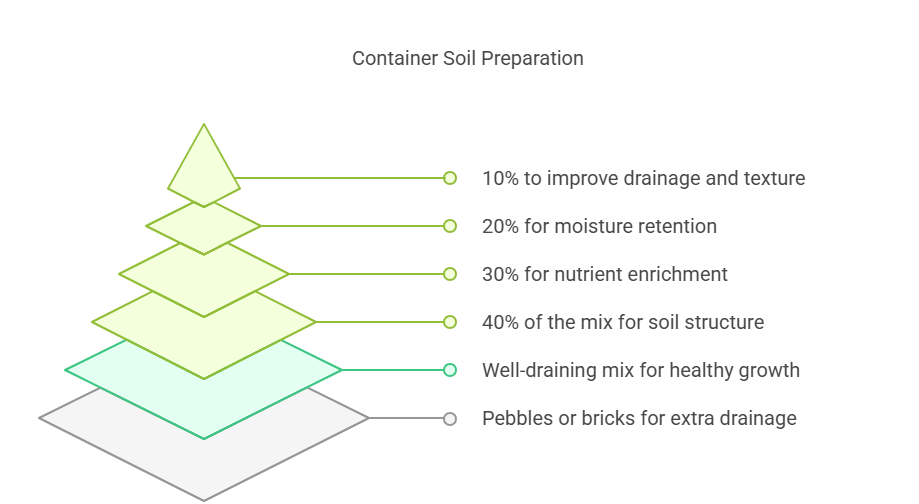- Fill with a well-draining potting mix. A typical mix could be: 40% garden soil + 30% compost + 20% coco peat + 10% sand.