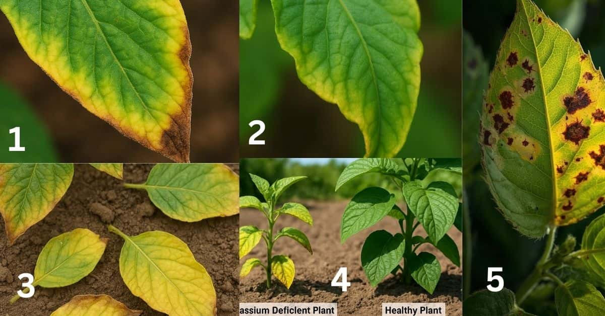 Visual guide to identifying potassium deficiency in plants — yellowing leaves, burnt edges, and growth comparison.
