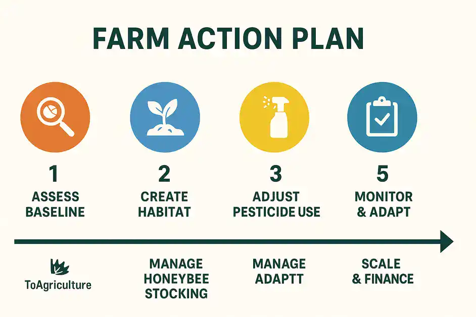 If you run a farm or orchard: start with a small pilot. Plant a 0.5–1 acre native strip, put out one hive (if needed) during bloom, and measure fruit set against an unsupplemented control. Want the exact step-by-step farm action plan and a planting calendar you can print and share with workers? Download the free Infographic — Farm Action Plan.