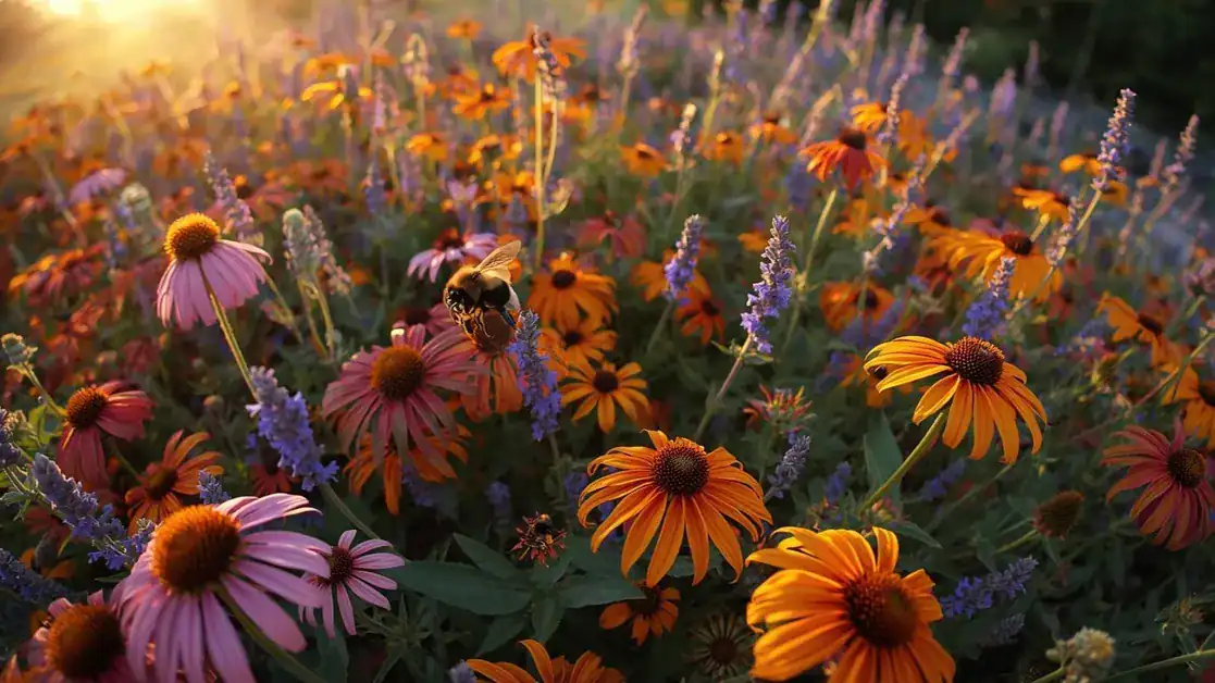 A buzzing visitor forages among a sun-kissed field of coneflowers and salvia, bathed in the soft glow of golden hour.