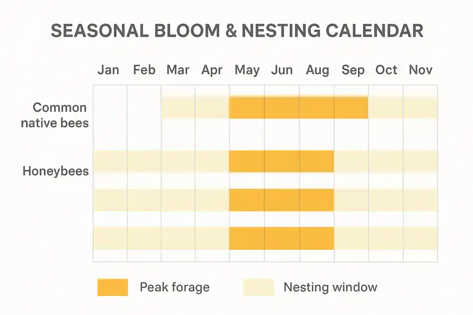 - Ignoring Timing: Bloom-time matters. Plan for something in flower every week from spring through fall. Gaps can starve pollinators.