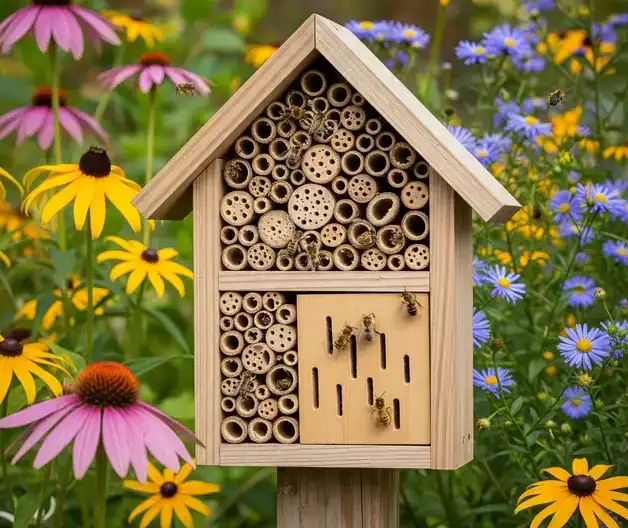 Bee Hotels & Bundles: Make or buy a simple bee hotel: a box filled with bamboo tubes or drilled blocks of wood. These attract cavity-nesting bees (mason bees, leafcutter bees). Put it in a sunny, sheltered location. For a DIY bee condo, drill holes of varying diameter, about 3 to 5 inches deep, into a piece of scrap lumber and mount it to a post or under an eave. Similarly, bundles of hollow stems (cut bamboo, reed, or pithy stems tied together) can attract solitary bees.[6]