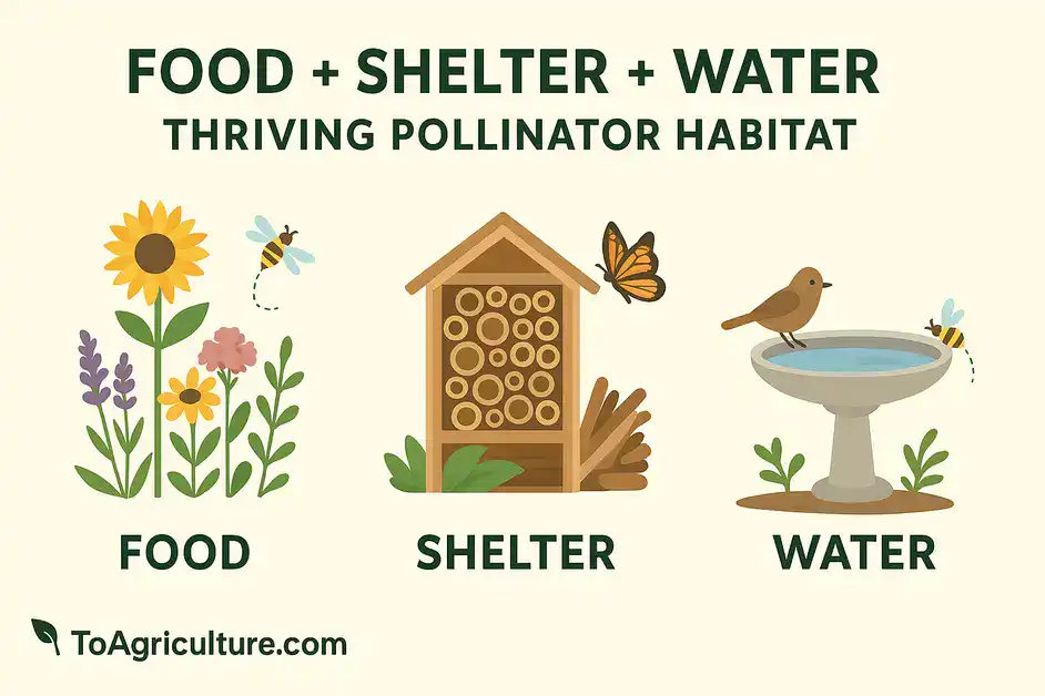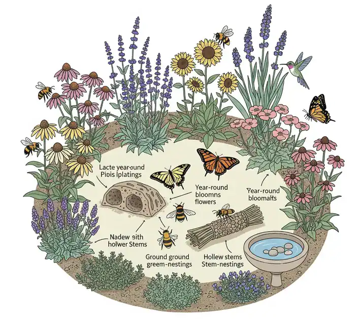Successful pollinator gardens follow a simple formula: Food + Shelter + Water = Habitat. This means providing continuous blooms (nectar and pollen), nesting sites (undisturbed ground and cavities), and accessible water. A few guiding principles are: