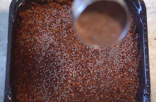 Evenly scatter the broccoli microgreen seeds over the moist growing medium, ensuring consistent spacing. You can use a spoon or your fingers to scatter the seeds.