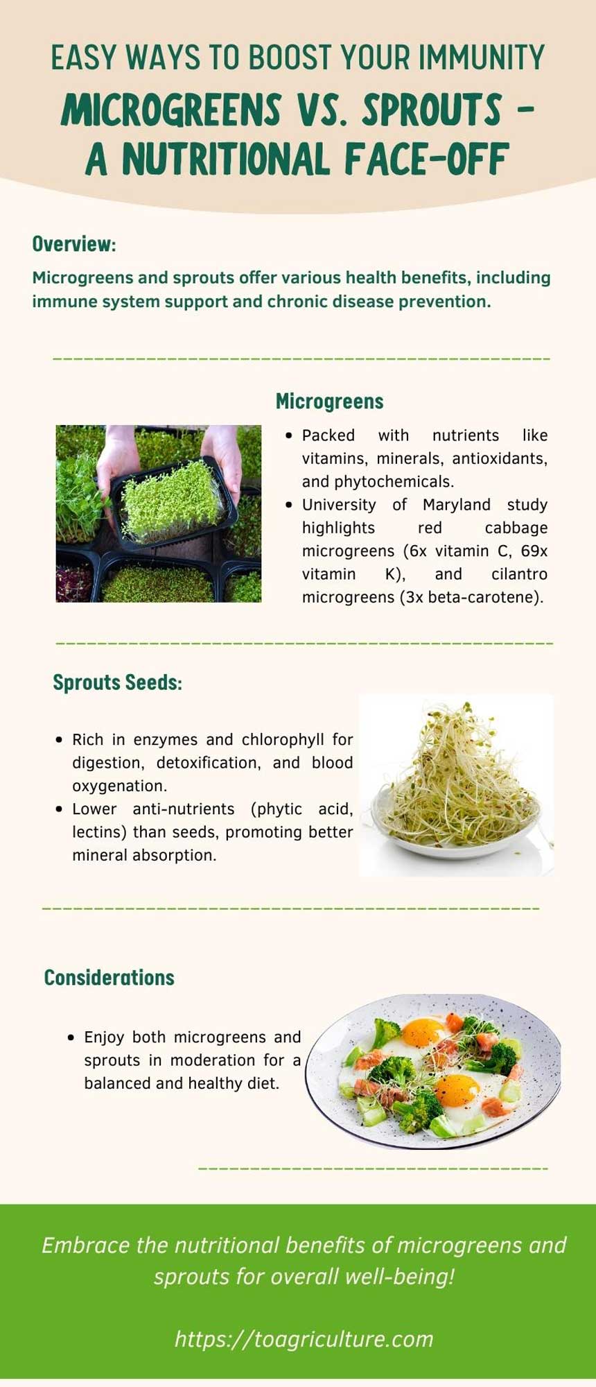 Both microgreens and sprouts are rich in nutrients, such as vitamins, minerals, antioxidants, and phytochemicals. These nutrients can help boost your immune system, lower your blood pressure, reduce inflammation, and prevent chronic diseases.